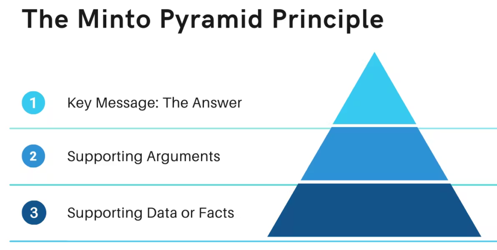 In essence, the Minto Pyramid Principle is a structured approach that enhances communication effectiveness by ensuring clarity, logical flow, and emphasis on key messages. Whether you’re writing a report, giving a presentation, or crafting an email, applying the Minto Pyramid can significantly improve the impact of your communication in the business realm.