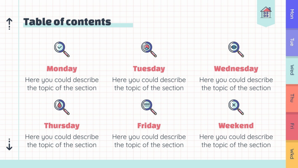 It is advised that you use completely editable vector icons so you may modify their colour, size, and so on without affecting the icon’s quality. After that, just place text boxes within the shapes to type out your agenda items.